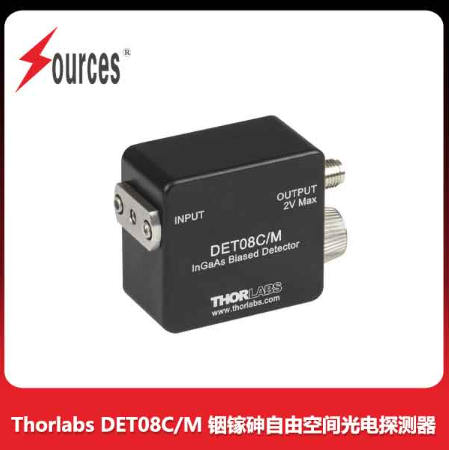 Thorlabs 铟镓砷自由空间光电探测器 四种型号覆盖从400到1700 nm的波长 带宽范围从2到5 GHz 上升时间从70 ps到155 ps 自由空间输入 输入端可选镀增透膜的平窗片或未镀膜的N-BK7球透镜 SMA输出接头 8-32(M4)螺孔,用于安装接杆