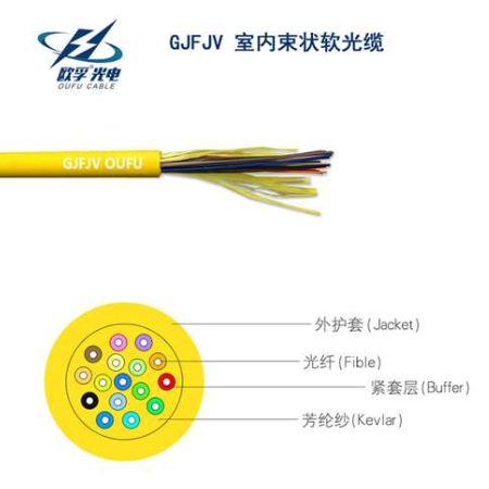 欧孚GJFJV室内光缆 产品特点: 1、在加工中选用线性好,出胶量小的螺杆及调节挤塑机真空度的大小,加工紧套光纤,保证了光缆中的紧套光纤外径均匀,剥离性好; 2、用于室内的产品对阻燃性能要求很高,为达到此要求,采用阻燃性能良好的护套材料; 3、由于采用专用的加工设备,优质的材料及优化工艺,使产品的附加衰减小; 4、紧套光纤在紧套前经过严格筛选,确保光纤的几何尺寸及传输性能满足用户需要。