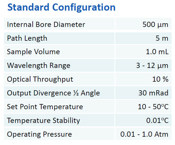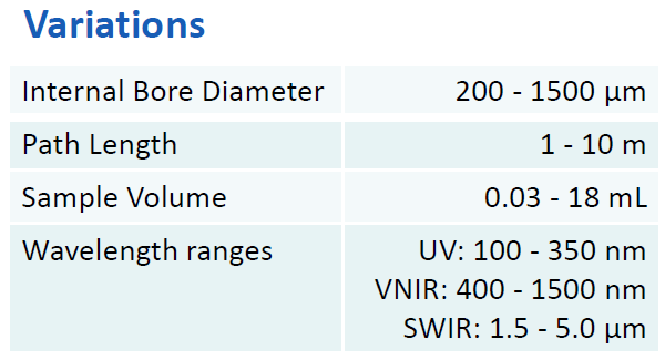 气室可定制,并且多种空芯光纤可选。 定制选项包括不同的样品体积、光程长度和波长范围。 此外,系统可以包括附加组件,例如微小体积压力传感器和电子驱动阀等。