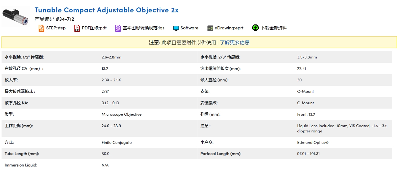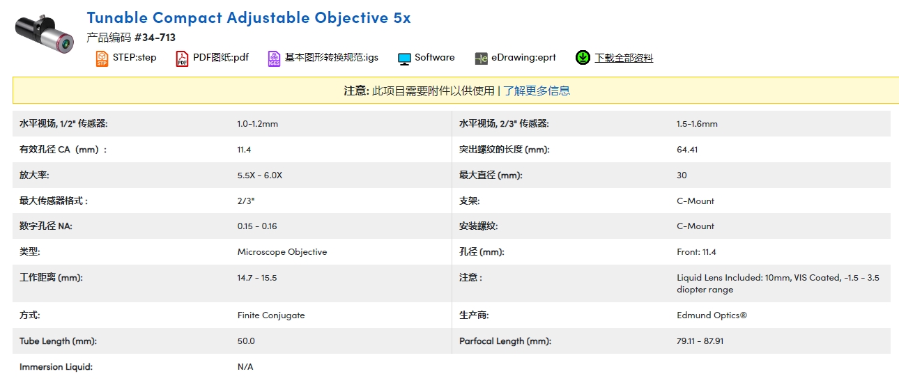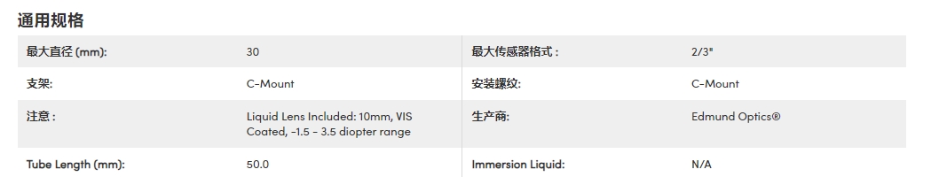 TECHSPEC® 液态镜头 CF 物镜采用集成液态镜头设计,尺寸更小,同时能够保持光学性能。传统物镜系统需要管透镜且长度较长, TECHSPEC 液态镜头 CF 物镜对每一个物镜进行优化,有效缩短系统长度。集成液态镜头允许通过调整施加到液态镜头上的电流来调节工作距离。