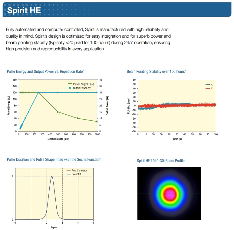 Spirit ™ 为高精度工业制造中的用于聚合物、薄金属、蓝宝石、聚晶金刚石和许多其他材料的微加工的飞秒激光器设定了新标准。此系列激光器提供高平均功率、高脉冲能量和高重复率,以提高产量。客户受益于其工业可用的短脉冲持续时间和优异的光束质量,从而能够以高的精度和质量加工复杂且具有挑战性的零件,在最高产量时几乎没有热影响区(HAZ)。