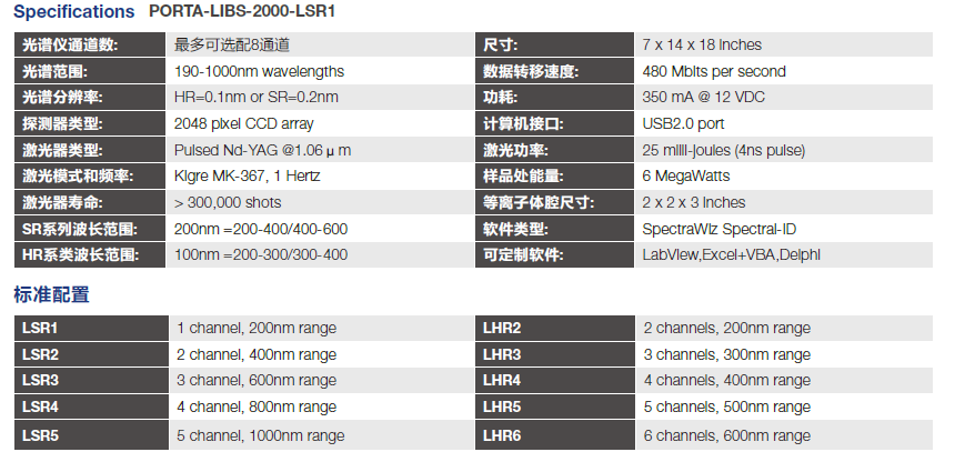 The PORTA-LIBS-2000 第一次真正实现了超便携及低成本的光谱分析仪,它可以实现对微量元素的实时定性测量,可用于专门的应用条件下,也可用于用户指定的任何地方。便携式高分辨率EPP2000 光谱仪集成了一个高强度脉冲激光,样品室,可对紫外-近红外未知样品光谱进行分析。便携箱的尺寸为18X14X7 英寸,可以通过12V 的适配器或电池组进行工作,进行测试时需要确定所需要的光谱仪的通道数量,多达8 个通道的光谱仪可通过USB2.0进行连接并且能够达到0.1 或0.2nm 的分辨率。激光诱导击穿光谱-LIBS 已成为常见的通过激光测量等离子体来测量元素的技术,这使得可以通过光学手段对固体、液体、气体等微量元素发射光谱进行检测,使用这种技术,无需样品制备,可进行无标定的定量分析。