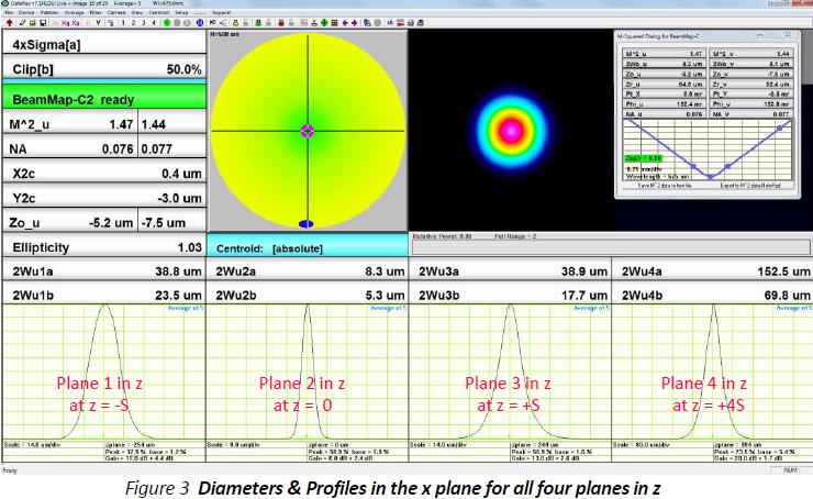 "),获得专利的BeamMap2是唯一的商用多平面激光束强度分析探头。下图是BeamMap2配套软件DataRay的一个屏幕截图。在这里你可以看到可以同时得到四个不同的z位置处的激光束强度分布。软件上显示的是这束光焦点的X,Y,和Z坐标和M2为1.47。