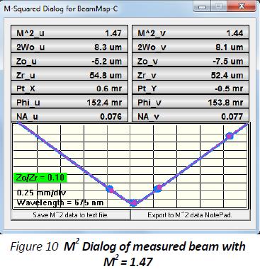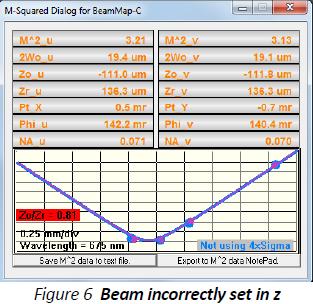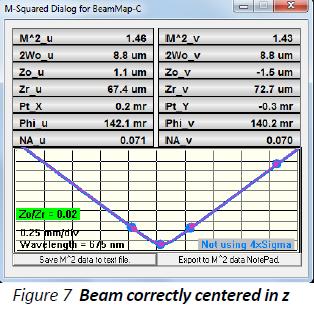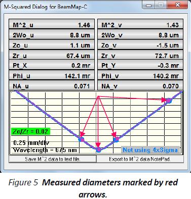 实践中,需要沿着Z轴调整激光束或仪器头直到Zo/Zr变绿。双曲线拟合是基于零平面测量的激光束直径2Wo和在其他三个直径测量值。