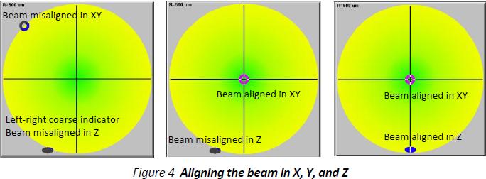 仪器或激光束沿着Z轴移动直到束腰接近‘0’平面(当Zo/Zr变成绿色)。这是一个非常简单的过程。看视频:实时调整激激光束腰。
