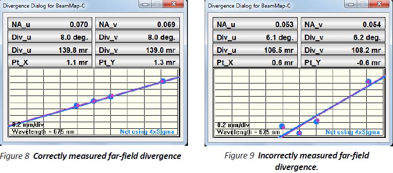 结果以数值孔径和全角发散度显示出来。如果太靠近焦点,结果将不正确。