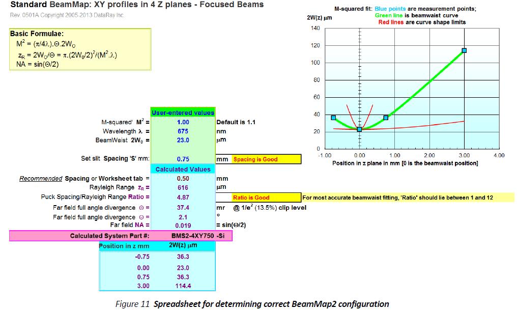 DataRay可以指定适当的探头通过运行一个简单的Excel电子表格(下图)基于束腰半径和波长范围。