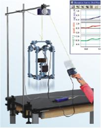 用旋转运动传感器来测量电梯向上移动的速度和加速度。绿色痕迹表示电梯里1Kg重物的法向力。另一个重量传感器是用来把电梯向上拉,并且可以测量学生的工作拉力。
