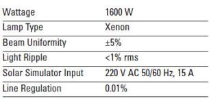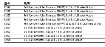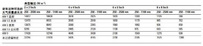 表1 全光谱太阳光模拟器(2 x 2-8 x 8 inch.) 的典型光束输出