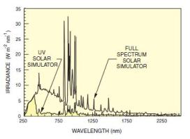 全光谱太阳光模拟器与1600 W紫外太阳光模拟器的光谱输出对比