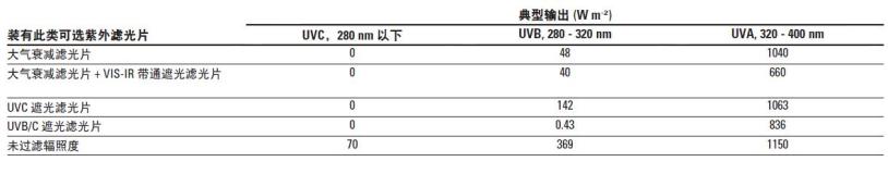 这种型号的模拟器可产生强度极高的紫外辐射和极少的可见光和红外线。操作此类模拟光源时必须格外谨慎。表2