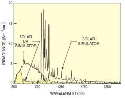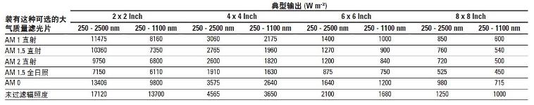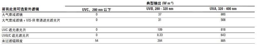 显示了此类太阳光模拟器与紫外太阳光模拟器的光谱输出对比。当与理波公司生产的可轻松互换的大气质量滤光片连用时,这类光源能模拟各种太阳光谱。表1 和表2