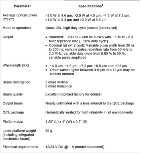 1101-XX-QCW-YYYY-UC-PF 量子级联激光器是一款高平均功率,用于OEM的脉冲红外光源。波长范围从3.8 μm and 12 μm.4.6 μm输出功率超过1W平均功率. 4.0μm输出平均功率超过2W。基于OEM应用的被动式散热系统使其很容易集成在客户的系统中, 防振. 仅需外界DC电源即可工作. PCB板上包含脉冲整形和供电模块,量子级联激光器和准直输出光学元件均密封于蝶形封装外壳内,系统无需现场调节,即可长时间稳定工作。