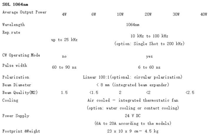 SOL是功率从4W到40W范围内结构最紧凑的调Q 二极管泵浦脉冲激光器,基于一体化的设计,电源和激光器集成到一起,故而具有坚固耐用和重量轻的特点。同时具有高峰值功率和出色的光束质量,使其非常适合集成于打标和微加工等设备中。