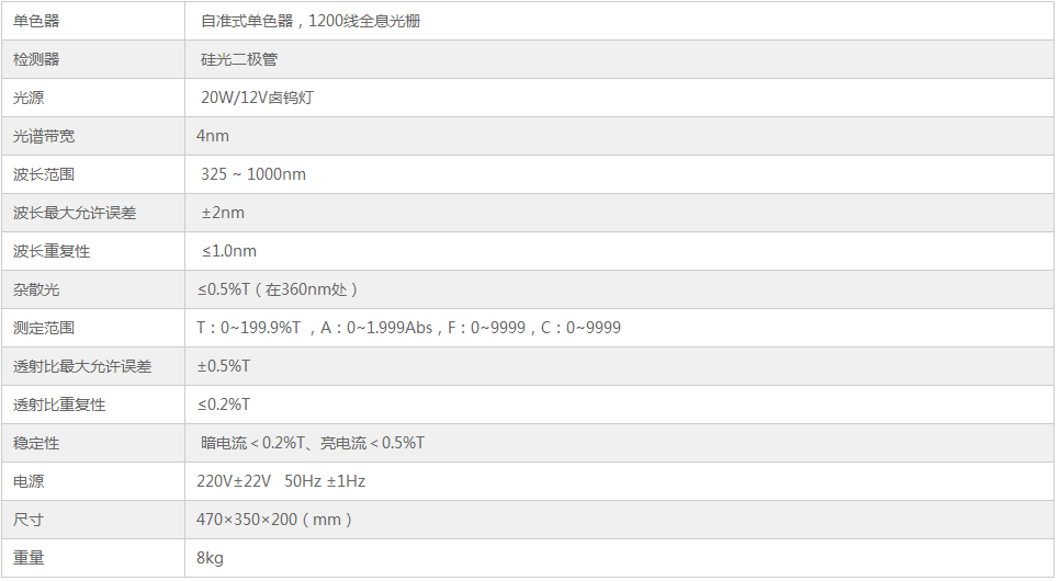 本产品适用于对可见光谱区域内物质的含量进行定量分析,可广泛应用于工厂、学校、冶金、农业、食品、生化、环保、石油化工、医疗卫生及各科研等单位实验室。