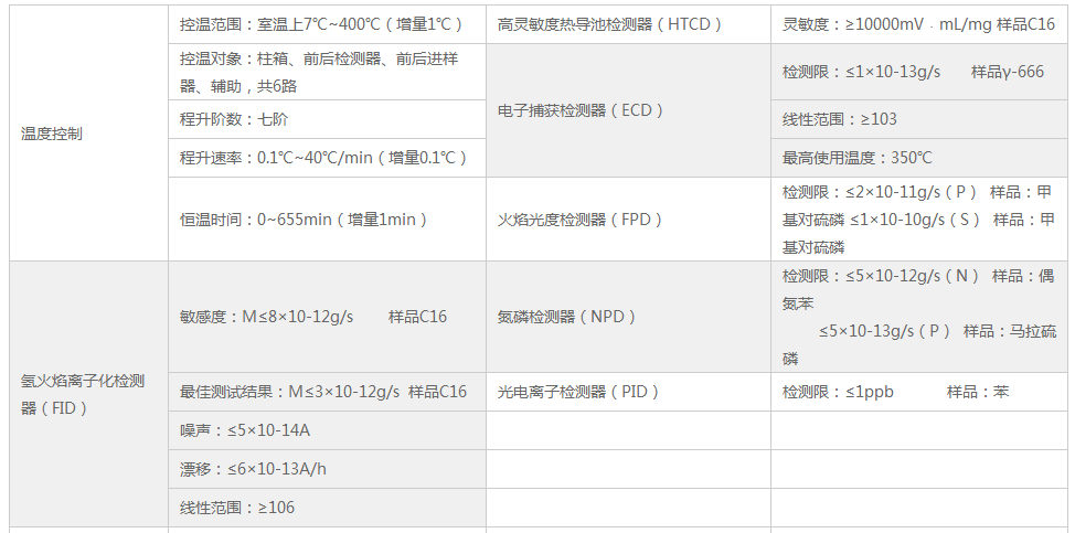 大容量柱箱能同时容纳毛细管柱和双填充柱;柱箱具有快速加热和快速降温即自动后开门机构(10min以内从300℃降至50℃,能根据温度变化自动调节开门角度),且可实现准室温控制,柱箱具有10阶11平台程序升温(需反控软件支持)。