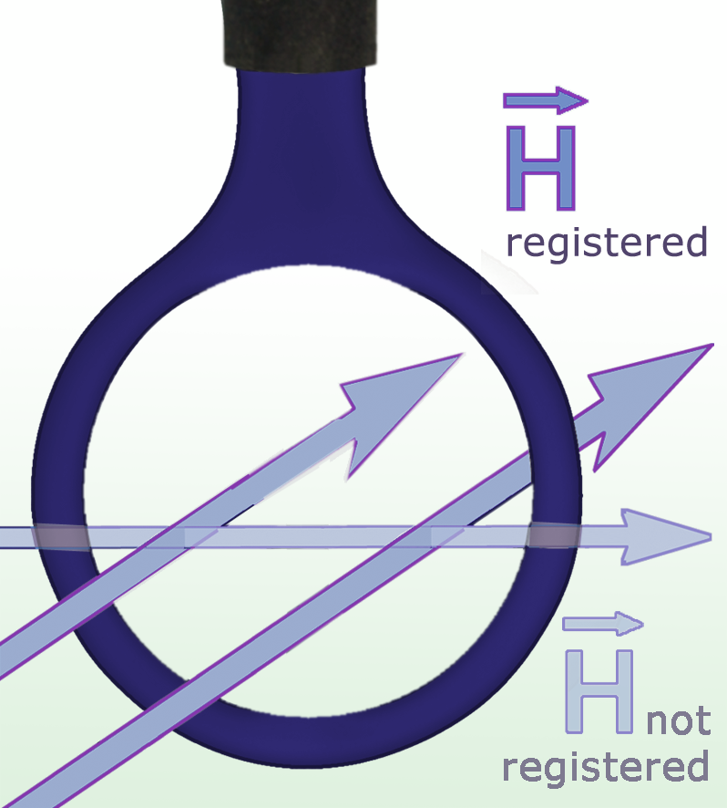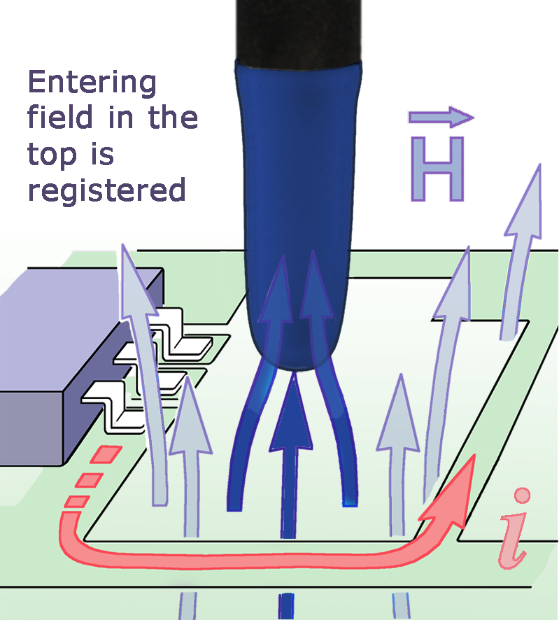LF-B3型磁场探头的测量线圈相对垂直于探头柄。当探头竖直放置电路板上时,其测量线圈直接平放在电路板的表面上。由此就能够测量到印刷电路板表面上很难达到的一些位置,如开关调节器的大元件之间的位置。 | |
