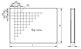 平台顶部有间距为25mm的M6孔,精度±0.1mm。任何1m2区域内的表面平整度为±0.1mm。底部表皮涂有坚固的装饰涂层。标准蜂窝芯由0.25mm耐腐蚀电镀钢板制成。特殊的环氧树脂组合可确保符合最高要求的粘合性,刚性,稳定性和阻尼性。桌面的侧壁由特殊的声学中空塑料制成,可抑制声学振动。侧壁覆盖着装饰性的黑色皮革替代品。