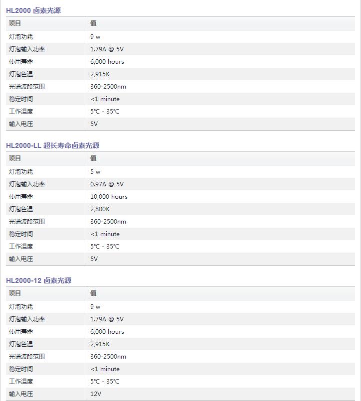 HL2000 卤素光源 具有诸多显著的优点: 1 超过 1 万小时的寿命 HL2000 采用光谱级的 专用卤素灯泡,具有更好的灯丝封装,确保了每颗卤素灯泡的寿命,有效降低灯泡更换频率; 2 优于 5‰ 的稳定性 HL2000 采用更高级别的供电电源,确保光功率输出每小时漂移不超过 5‰ ; 3 高于 ±0.127mm 的灯丝定位精度 作为标准辐射光源,每台 HL2000 都具有高灯丝定位精度,确保了批次的一致性。