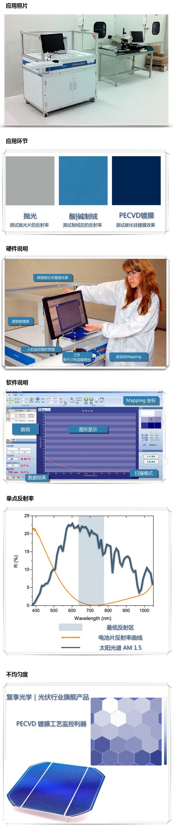 R9000-2DMA 全自动标准D8积分式反射仪是上海复享光学股份有限公司在光伏行业推出的旗舰产品之一。产品应用在电池片制绒工序监控环节,为客户电池片质量品质把控,降低损耗提供了有效的检测方案。 R9000-2DMA 系列产品根据太阳能电池片的特性和光伏行业用户使用习惯定制,基于传统反射率仪上重新研发和创新。产品凭借业内较高测试速度、特别的 Mapping 功能、高稳定性以及可重复性获得了业内客户的一致肯定。
