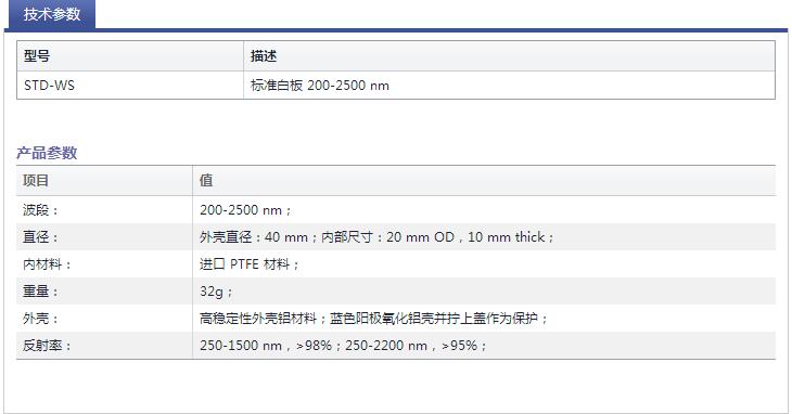 STD-WS 系列标准白板 采用高品质进口 PTFE 材料加工打磨而成,适用于紫外-可见-近红外(200~2500nm)宽光谱谱段,能够提供全谱段 98% 以上的反射率,是漫反射光谱测量的重要组件。 典型应用领域: 表面粗糙物体反射率的测量 标准白板是用于反射率测量的标准漫反射参考物,适合于测量各种粗糙样品(如陶瓷、毛面玻璃、塑料等)表面反射率。 STD-WS 标准白板 具有以下显著特点: 1 表面反射率高 250nm~1500nm 波段反射率大于 98%,250~2200nm 反射率为大于 95%,能够提供全谱段 98% 以上的反射率; 2 适用性广泛 STD-WS 标准白板能够配合复享光学的光纤光谱仪和光纤光源一起组合成一个系统,进行各种样品反射率测量; 3 金属外壳多重保护 白板外部嵌在一个外壳材料为阳极氧化铝盒里面,并有带螺纹的金属盖,具有防水、稳定性好的特性。