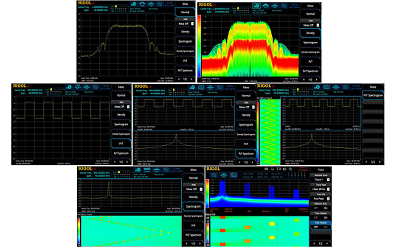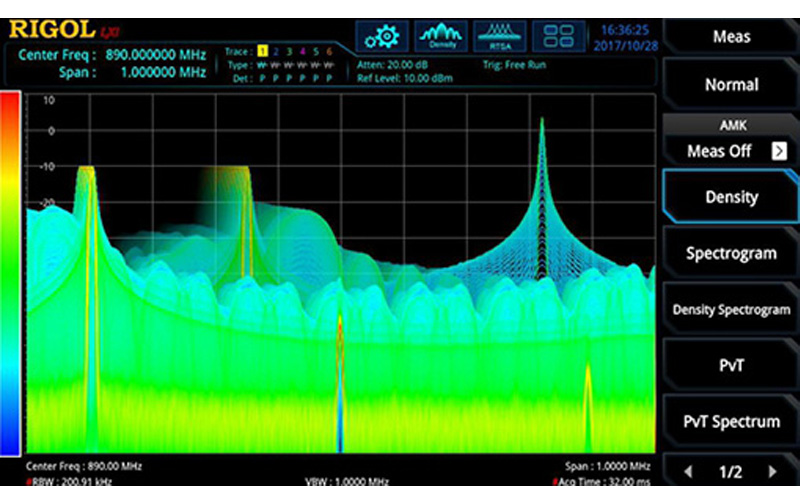 使用RSA5000的7种实时信号显示模式可以更轻松地捕获,隔离和分析射频信号和系统。功率与时间的关系以及频谱图显示了信号如何随撷取时间或连续撷取时间的变化而变化。 Normal(正常)和Density(密度)显示跨频率跨度的功率,可以使用不同的迹线和检测器选件,也可以使用出现概率数据。