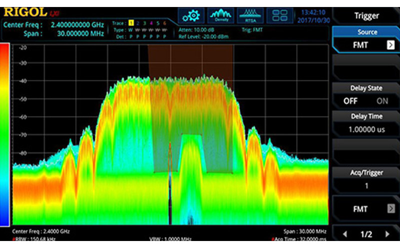 FMT频率模板触发是实时频谱分析仪才独有的触发模式。您可以快速构建模板,并对符合模板规则的信号进行准确的定位及触发,从而发现监测范围内偶发的异常信号。