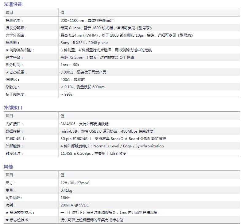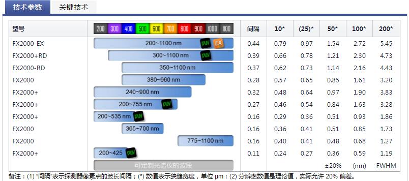 典型应用领域: 紫外烟气分析 要求较高的信噪比、紫外灵敏度和光学分辨率,这需要一款综合性能优越的光谱仪。 反射/透射光谱 由于样品的多样和测试条件的复杂,因此光谱仪需要具有较强的系统通用性和适应性。 LED 分选 光源通常具有较大的辐射强度范围,这需要光纤光谱仪具有超过 3000:1 的动态范围。 FX2000 光纤光谱仪 具有以下显著特点: 1 双闪耀光栅 FX2000 采用进口高品质 Richardson 光栅,并且在 200~1100nm 全波谱型号中采用高品质机型使用的 双闪耀光栅,有效平衡全谱段响应; 2 紫外敏化 CCD FX2000 光纤光谱仪采用德国工艺进行 CCD 的 紫外敏化,紫外转化效率较传统高出 20%,寿命延长一倍,利用紫外差分吸收光谱,非常适合一氧化氮、二氧化硫的检测; 3 优于 3000:1 的动态范围 FX2000 光纤光谱仪历经复享新一代的电子工程设计,具有超过 3000:1 的动态范围,覆盖强度范围大。