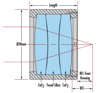 理想的宽带设计和应用,在193~1000nm 的波长范围内,紫外到近红外(UV-to- NIR)校正了空气间隔的三片镜组件能保证一致的焦距(参见下面轴向色差信息)。一流的氟化钙和熔融石英生产工艺,这些无限结构组件非常适合成像系统在宽光谱中的应用。在荧光研究中有典型的应用,荧光研究中所发出的光是可见光或是近红外光,或者应用在双通系统中,在这个系统中,用相同的镜头来照明激发材料来收集它所发出的光。镜片元件没有镀膜并安装在直径为30mm的铝质镜筒内。也可选用镀有增透膜的镜片元件,但订单少的情况下需要提前申请。