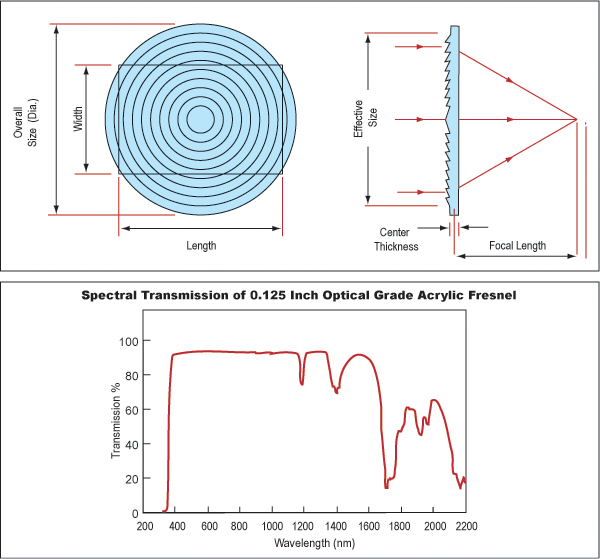 菲涅尔透镜用一系列同心槽代替了传统透镜的曲面,浇铸成一个薄且轻的塑料板面。每个环带都相当于一个独立的折射面,十字剖面像许多小棱镜,这些环带都能使入射光线会聚到一个共同的焦点。,因为这些透镜非常薄,故由于吸收而损失的光能几乎很少。菲涅尔透镜在效率和成像质量方面比较折中,高凹槽浓度就有高成像质量,然而低凹槽浓度却有好的效率(在聚光系统中有很好的应用)。在无限共轭结构系统中,透镜侧面的凹槽会有较大变化。
