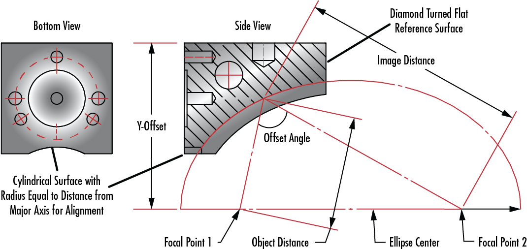 TECHSPEC®离轴椭圆形反射镜是有限共轭聚焦镜,用于以设定角度成像。这些反射镜具有固定的共轭图像和物体路径长度,提供从物体平面到成像平面路径长度的最高2.5倍放大。离轴椭圆形反射镜常用于在傅立叶转换红外光谱(FTIR)系统,其中宽带光源需要使用带轴外设计的金属反射器,以满足空间限制。TECHSPEC® 离轴椭圆形反射镜的底座上具有金刚石车削的圆柱形表面,其半径等于椭圆形主轴的距离,用于将反射镜与主轴和平坦参考表面对齐,该表面与主轴垂直,由金刚石车削而成。如果您的应用需要具有定制规格的离轴椭圆形反射镜,请与我们联系。