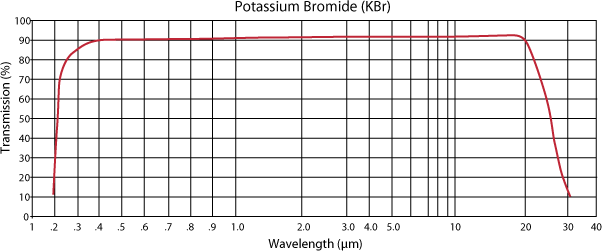溴化钾(KBr)是一种普遍用于FTIR光谱学的材料。溴化钾的光谱范围比氯化钠(NaCl)大一些,并且具有介于250nm - 26μm之间的绝佳透射率。在此范围内,其折射率介于1.46 - 1.59之间。溴化钾具有水溶性,因此其表面不可与水分接触。若与水分接触,则将会导致窗口片表面分解。溴化钾窗口片具有很好的机械冲击抵抗力,并且能够轻易地分开以及在300°C的环境下使用。其密度为2.75g/cm3,而努氏硬度则为7.0。
