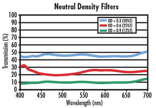 中等浓度滤光片呈现灰色并且可减少到达传感器光的数量。由于在可见光的范围内透过率变化较小,所以对色彩平衡几乎没影响。要有大量的光通量就要缩小光圈,中等浓度滤光片考虑到大光圈这样可减小景深。这是从背景中分离出来的重要信息。靠叠加滤波片,实现其他光学浓度值是可能的。每个夹具都有公母螺纹,所以这些带夹具的滤波片可以装夹在一起。光密度显示了一个额外的关系;例如,由一个0.6光密度和一个0.9光密度的两个滤光片叠加而成的滤光片的光密度值为1.5。透过率和光密度之间有如下方成的联系:透过率=10-光密度 X 100=透过率百分值。