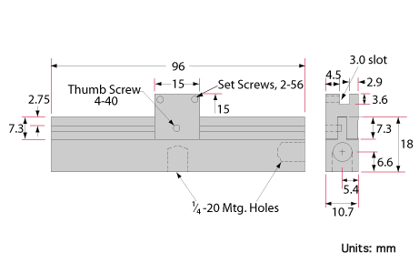 光学件固定在一个可来回运动的架子上,形程为96 mm,用两个2-56规格的尼龙螺钉固定光学件,中心间距为12mm, 用一个尼龙平垫垫在光学件上。铝制滑轨上开槽以控制划块,由手调螺钉锁紧。这个手调螺钉既可作为把手来控制行程又可锁定位置,本品包括六角螺钉扳手,但不包括接杆。