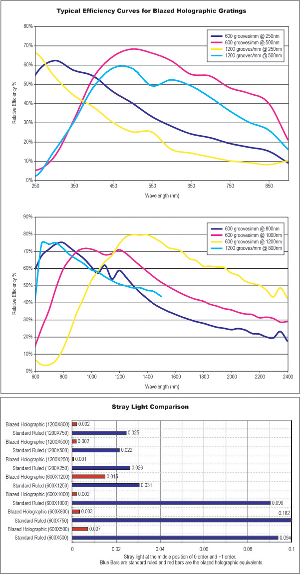 闪耀全息光栅比常规机械刻划光栅的杂散光少,同时不降低衍射效率。首先,全息照相光栅采用一流的干涉技术制成;其次采用离子光束蚀刻专利技术,生产出标准锯齿设计。但是,由于本技术不需要金刚石工具,因此不会引起杂散光,可用在需效率高,分辨率高、杂散光少、无鬼影的场合。可在分光计、分光光度计、单色仪上应用。本品镀铝膜,在紫外光、可见光和红外光谱范围内有最大的透过率性能。