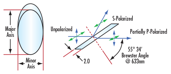 TECHSPEC® 布鲁斯特窗设计用于按布鲁斯特角度(55.57°)定位时呈现原形轮廓。TECHSPEC® 布鲁斯特窗具有激光级表面质量和平行度,可将传输波前畸变限制至 λ/10。当在 55.57°使用时,这些窗片可最大限度地减少 P 偏振光的损失,尤其适合在激光腔内使用以及产生线性偏振光的应用。