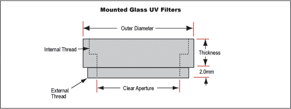 用带有标准照相和机械视觉透镜滤光片夹具螺纹装夹的光学UV等级的滤光片可提供,比较适合紫外光被截止而可见光通过的场合应用。装配的通光孔径为5mm,小于装配直径。除了62mm和72mm的为3mm大,其余的最大的外径为2mm,大于装配直径。夹具是非旋转的。