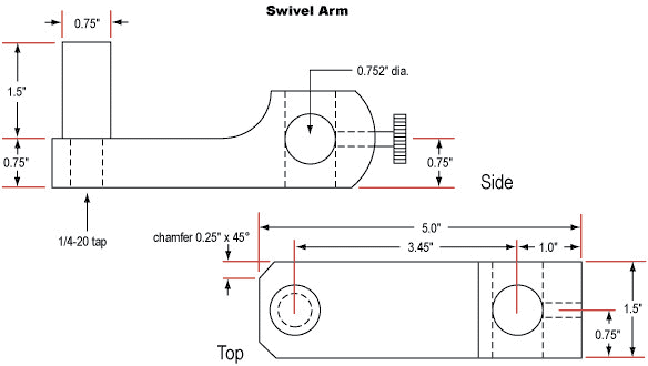 90° Angle Mount #39-355 features two ¾" thru holes at 90° with locking knobs. All Ring Mounts feature ¼-20 mounting hole, set screw for securing post, or optical component within the inner diameter. Swivel Arm #03-684 features a 0.75" diameter post which accepts rack and pinion focusing mount and allows swivel movement. Infinity Mounting Adapter #39-358 features male and female T-thread to replace 24mm tube section of infinity lens.
