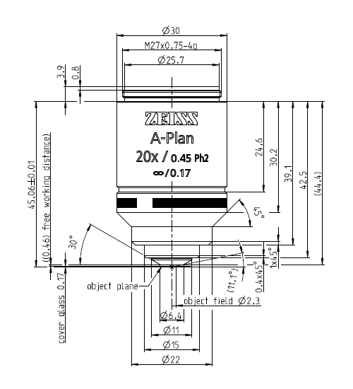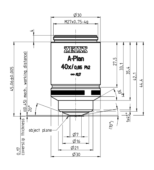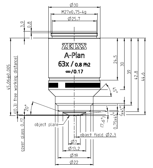 规格 | Objective "A-Plan" 20x/0.45 Ph2 M27 | Objective "A-Plan" 40x/0.65 Ph2 M27 | Objective A-Plan 63x/0.8 Ph2 M27 |