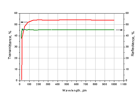 制作THz分束镜的材料是HRFZ-Si. 这些分束镜没有镀膜,但是在宽的波段范围内都可以提供提供透射和反射比约为54/46 (%)。反射和透射曲线如下所示。
