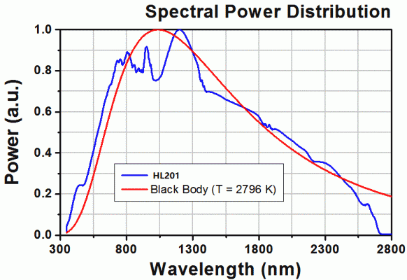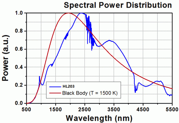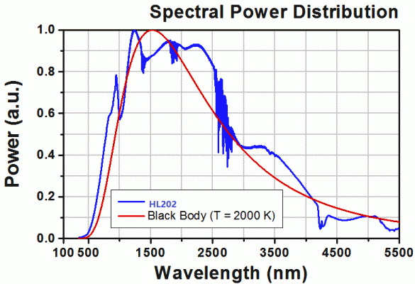 HL203 类卤钨灯光源光源具有在500 至9000 nm 间的恒定光强,>1.5 W 的黑体辐射光谱。由于该黑体光谱覆盖了可见光和中红外光谱范围,这个光源是集成到中红外测量和分析系统的理想选择。它使用了一个位于椭球反射器内的碳化硅棒,以增大光输出。一个CaF2 透镜准直光源发射的光。包含的自定义滤光片支架加工成匹配光源外壳的高度,并且也经过了红色阳极氧化处理。