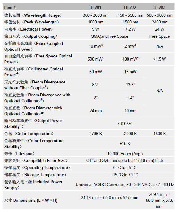 所有光源型号都有一个集成滤光片支架,其中HL201 和HL202 提供用于光纤输出的SMA 接头,而HL203为自由空间输出。光纤耦合光源上的光纤耦合封装能被准直封装(分开出售)代替,快速释放装置用于安装光纤耦合封装,以保证在代替光纤耦合封装时保持耦合效率。通过对定制光学系统使用SM1QAM 快速释放转接件,内螺纹透镜套筒也可以直接附加到每个光源前。由于光源尺寸小(请见规格标签),用户能够灵活地放置在拥挤的光学平台上。所有光源可以通过底部的两个M6 螺孔安装在Ø1 英寸接杆上。