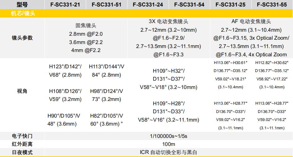 F-SC331是中型尺寸的筒型摄像头,两种不同颜色的外观(黑或白的底座)。
