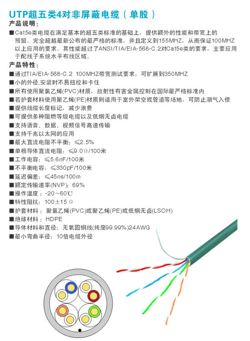 产品详细介绍 超五类非屏蔽双绞线是在对现有五类屏蔽双绞线的部分性能加以改善后出现的电缆,不少性能参数,如近端串扰、衰减串扰比,回波损耗等都有所提高,但其传输带宽仍为100MHz。